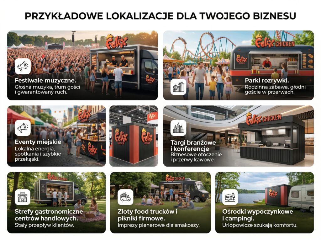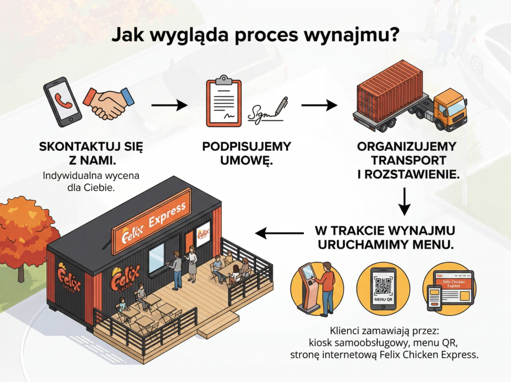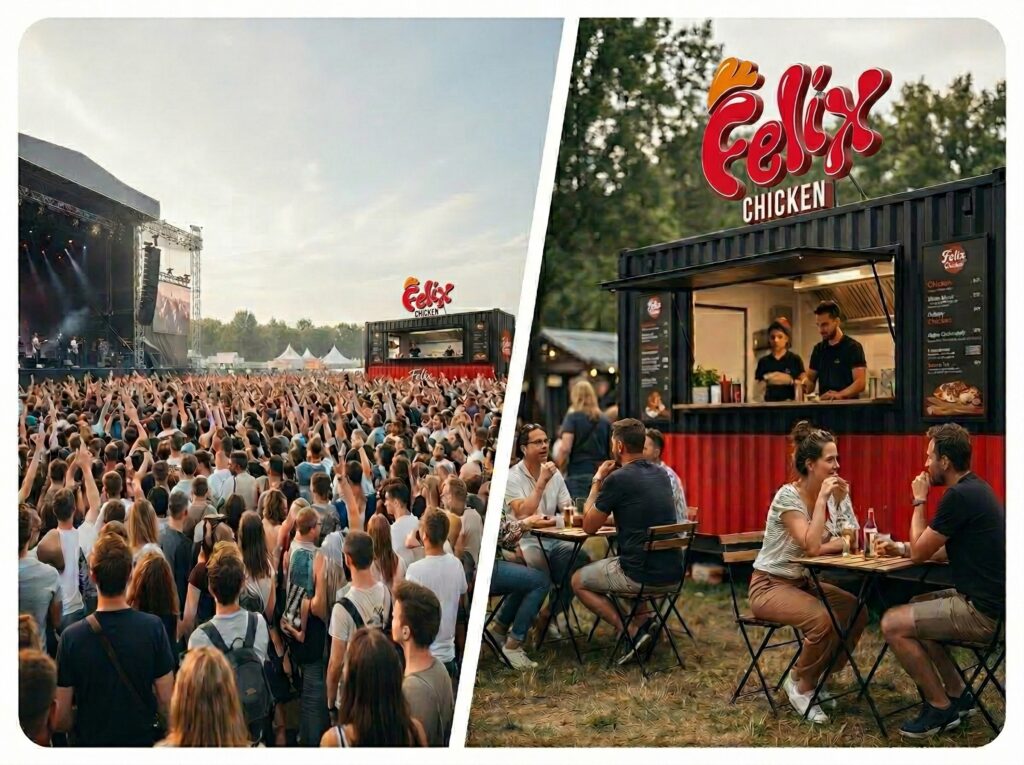 Organizujesz koncert, festiwal, wydarzenie firmowe, zlot food trucków, imprezę miejską, sportową lub prywatną? A może zarządzasz lunaparkiem, strefą gastronomiczną, targami lub sezonowym punktem nad jeziorem? Nasz mobilny kontener Felix Chicken Express to idealne rozwiązanie dla każdego eventu – niezależnie od jego skali.